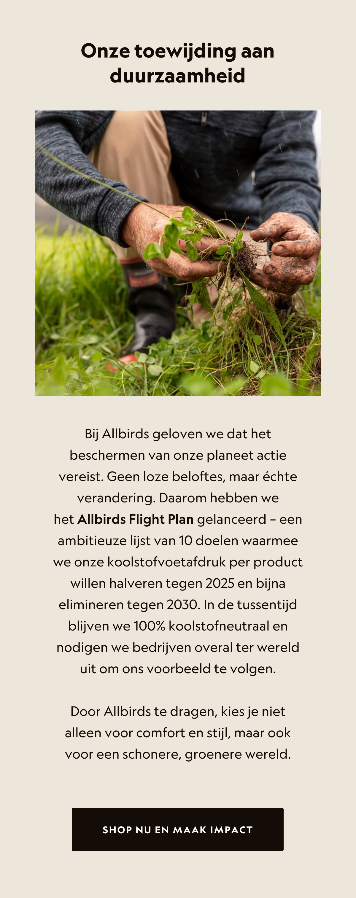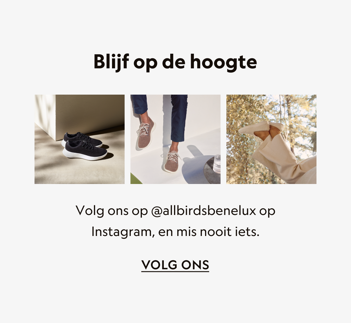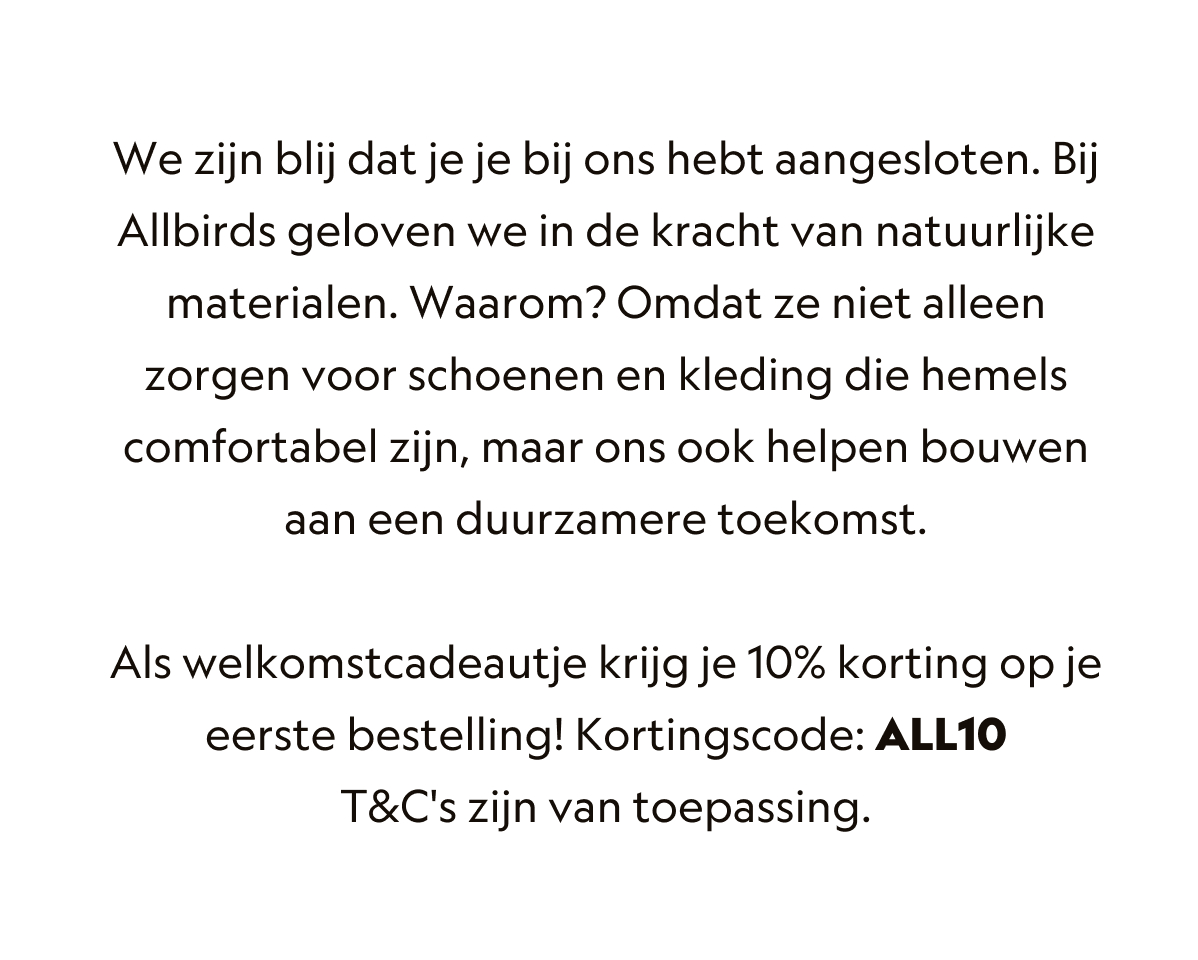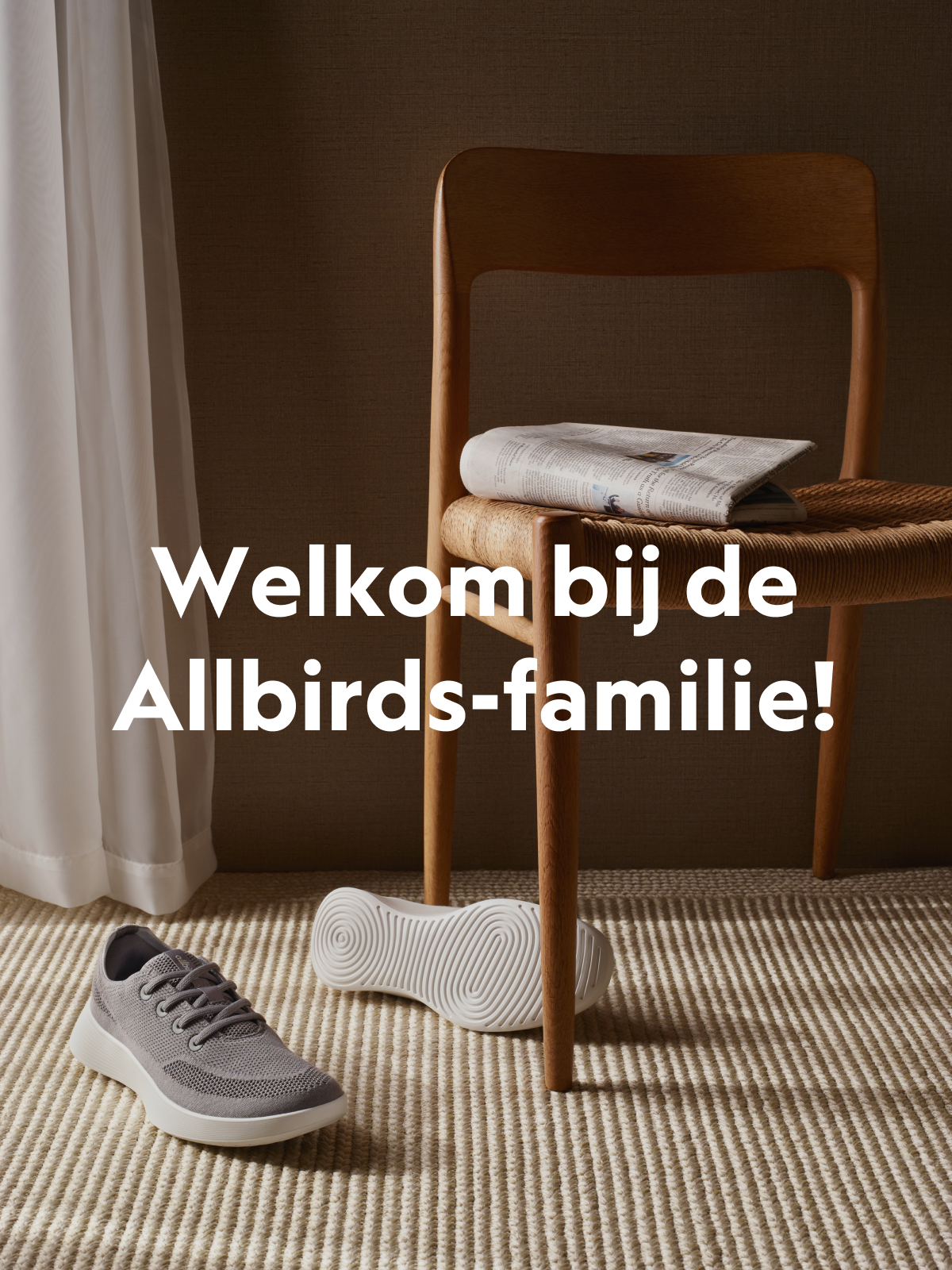 welcome email introduces Allbirds Benelux, showcasing product categories and sustainability.